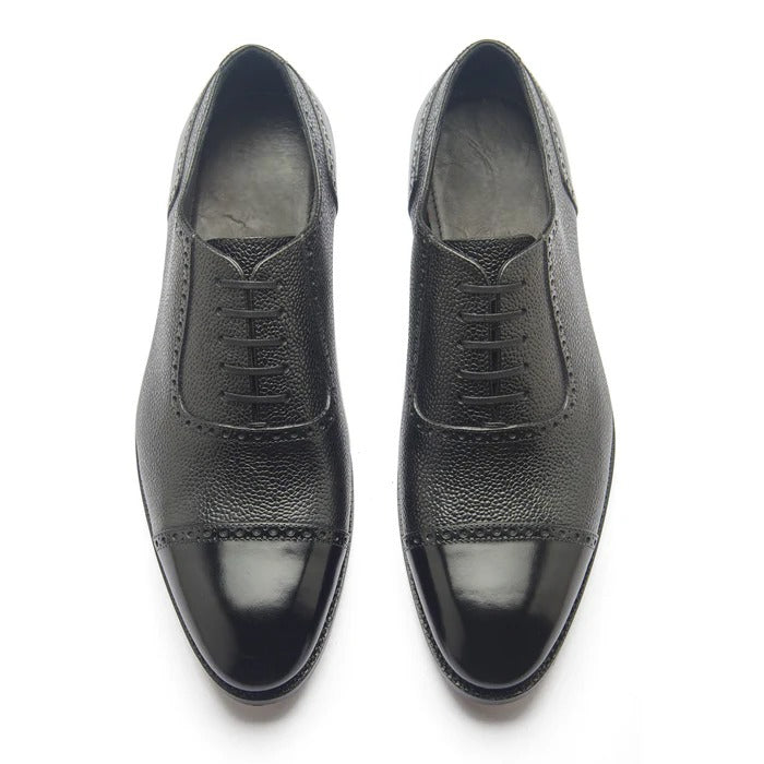 The Huayra Adelaide Oxford is a perfect blend of sophistication and durability, designed for men who appreciate fine craftsmanship. With a 5-eyelet lace-up style, this classic shoe features a cap-toe design with brogue detailing, adding an elegant touch. Made from premium black pebble grain leather, it offers a textured and refined look, making it an excellent choice for business attire and formal occasions.