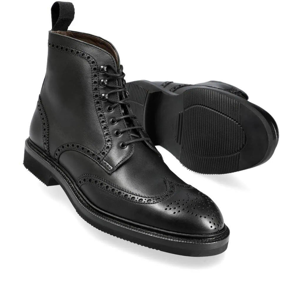 Step bold, stay timeless. The Lexaitaliano Wingtip Boots in Black Funchal blend heritage detailing with a sleek, modern edge. Handcrafted from premium Funchal leather, these boots feature intricate wingtip broguing that adds character to the bold black upper. The high-ankle silhouette, paired with a strong stance and fine stitch detailing, makes these boots a go-to for both sharp formalwear and elevated everyday style. Built for men who lead with confidence.