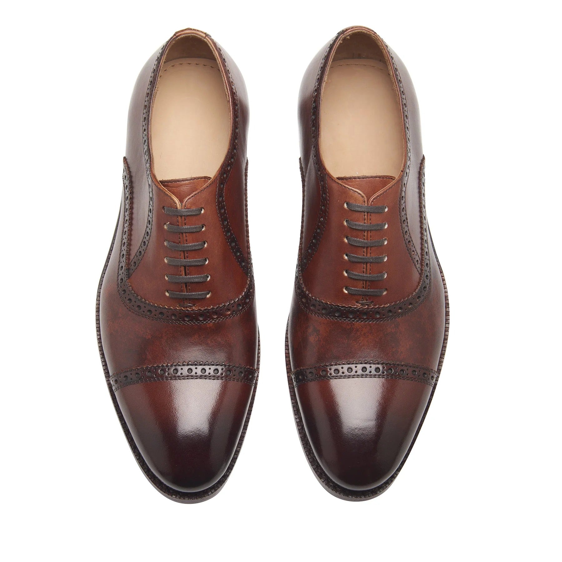 The Nouveau Quarter Brogue Oxford is a refined take on classic footwear, featuring a cap-toe design with quarter-brogue detailing and a distinctive back strap instead of a conventional counter. This unique touch enhances the shoe’s sleek and contemporary appeal.
