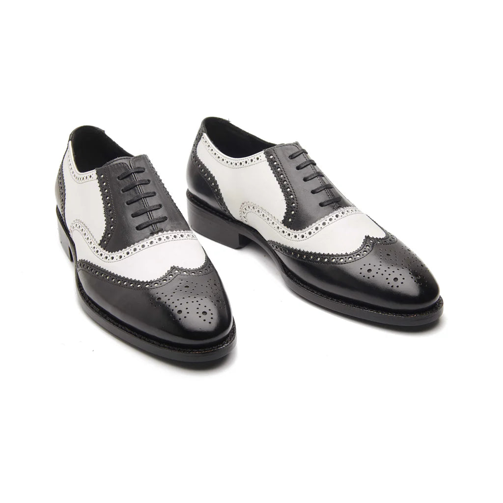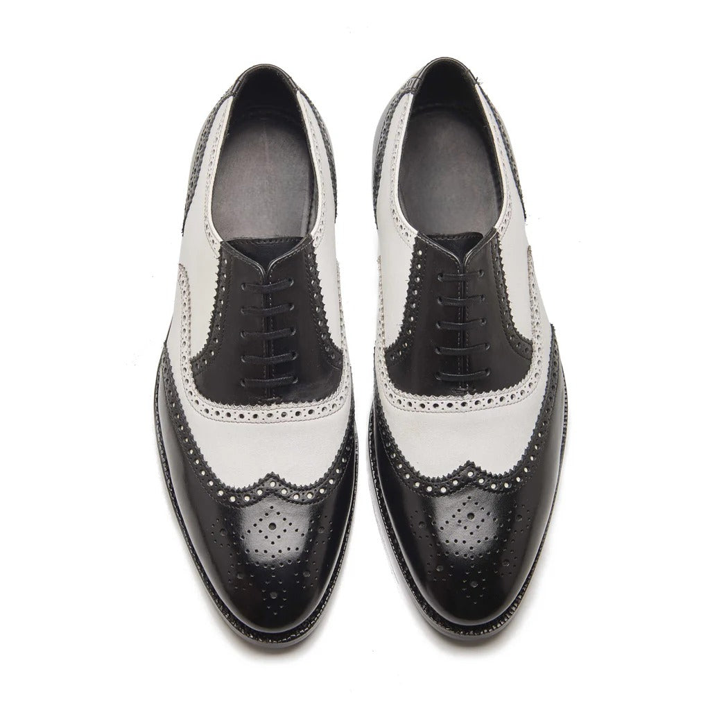 A timeless nod to vintage elegance. The Specter Spectator Shoes blend classic sophistication with modern craftsmanship. This Full Brogue Oxford design features a striking two-tone colorway, with a Black wingtip, counter, and eyelet components set against a contrasting White quarter panel, making it a true standout in any wardrobe.